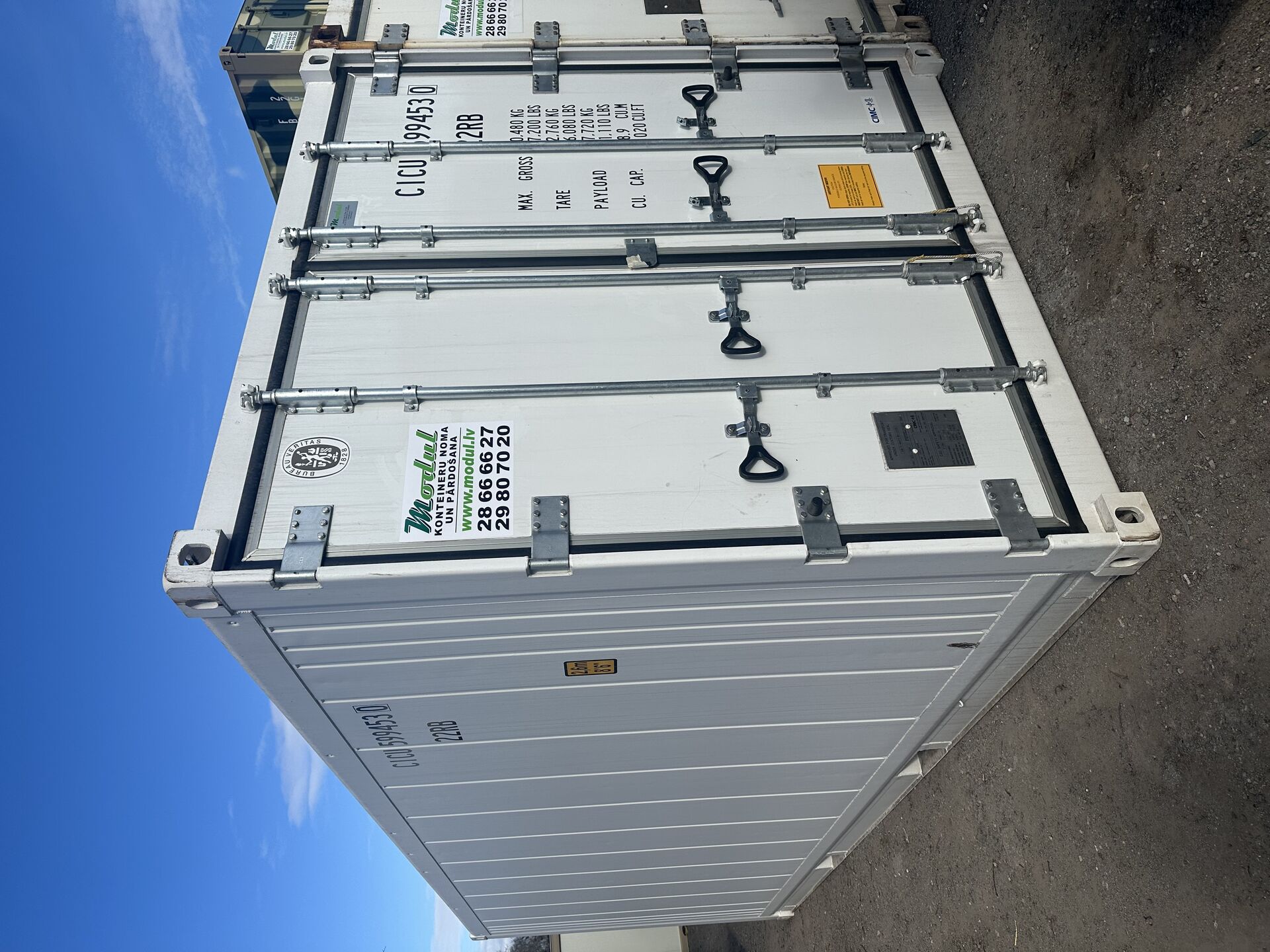 Internal Dimensions: Length: 5513 mm Width: 2286 mm Height: 2269 mm Features: Compressor: Scroll (spiral) or piston Condition: New or used Volume: 28 m³ Container type: Refrigerated Container model: Standard Refrigerants: R12, R134A, R404A, R409A Freon: R134a Weight: 3050 kg Max load: 21950 kg Max total weight: 25000 kg Cooling capacity: 2900-4200 kcal/h Heating capacity: 4200-4400 kcal/h Average energy consumption: 4.6 kW Electric power supply voltage: 360/460 V, 3-phase, 50 Hz Temperature range: -40ºC to +30ºC Capacity of European pallets (1200 x 800 mm), pcs: 10 Advantages of this container: Ability to maintain the freshness of cargo with specific storage temperature requirements. Long-term maintenance of the set temperature, even when the refrigeration unit loses power. Convenience during loading and unloading, thanks to the standardized refrigerated container dimensions and special equipment. The refrigeration unit consists of two main blocks: the refrigeration unit and the body. Load-bearing frame. Walls made of sandwich panels. The outer cladding is made of 2.0 mm thick duralumin or profiled steel, insulated with a polyurethane foam layer and 0.6 mm thick food-grade corrosion-resistant steel. Floor made of T-profile aluminum alloy, designed for handling with warehouse forklifts. Doors made from the same sandwich panels as the walls, equipped with special latches to ensure airtight sealing. The body includes: We provide containers of the following brands and offer service, spare parts, and accessories: Carrier Thermo King Daikin