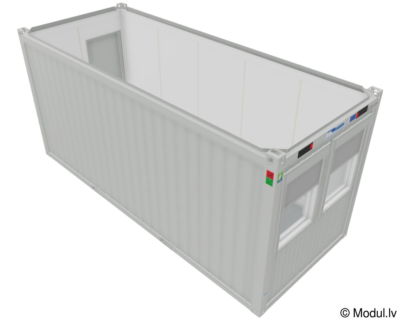 Konteinera komplektācija: PVC logi ar atverumu (1.gb.) Metaliskās durvis ar slēdzeni (1.gb.) Dienas gaismas lampa (1.gb.) Konteinera ārējie izmēri: Garums: 6.055 m Platums: 2.435 m Augstums: 2.591 m Konteinera iekšējie izmēri: Garums: 5.915 m Platums: 2.295 m Augstums: 2.340 m Durvis: Standarta izmērs: 875 x 2,125 mm Pilns atvērums: 811 x 2,065 mm Konteinera svars: 1.600 kg